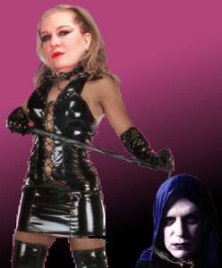 [Pearl Forrester walks up behind Bobo, clad in a PVC, dominatrix dress. She is leading the Observer by a rope around his neck. Bobo yelps in surprise as she pushes him off screen.]