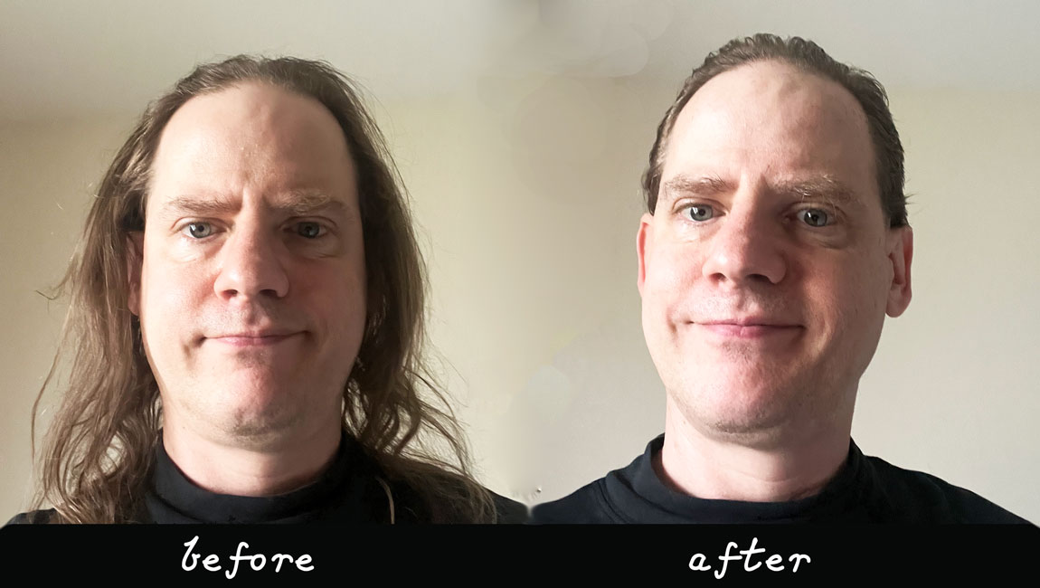 My hairline has been slowly receding and my hair has been thinning all around. So I thought about cutting it, but didn’t follow through. Sadly, there’s this striking bald patch on top. I wouldn’t notice if it weren’t for the overhead camera posted at the grocery store self-checkout: