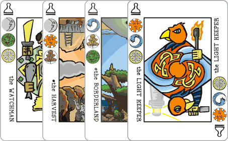 Cross-suited cards give the Decktet its structure. A set of cards showing one of each suit might be as few as three cards or as many as six. (This is exploited in the games Bharg and Terrapin.) It is possible to lay out a line of cards so that each one shares a suit with its neighbor, but the end cards do not share suits at all. (This is exploited in Biscuit.) In a trick-taking game, it is possible to trump and follow a non-trump lead with the same card. (This is exploited in the games Ace Trump.) In a resource management game, you may be forced to choose between using a card for one of its suits or the other. (This is exploited in the games Chancellors and Emu Ranchers.)
