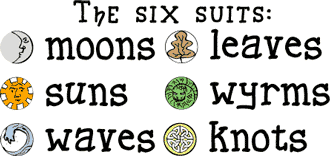 The basic Decktet is a deck of 36 cards. There are six different suits (pictured on the right).