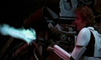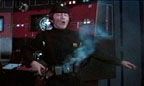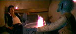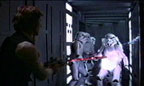 Now let's look at the new scene. Greedo is sitting with Han at gunpoint again, only this time Greedo states his intent to kill Han and then shoots the wall. Han quickly avenges the stucco and blows away Greedo. Boy does the new scene stink! Even a stormtrooper could have hit Han at that distance! Perhaps Greedo turned to a life of crime after flunking out of Stormtrooper Academy.