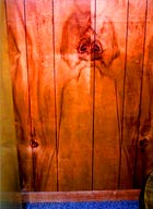 An album in the cabin contained letters from previous guests. One anonymous visitor warned us about this spirit that lived in the woodwork next to the refrigerator.