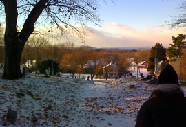 1dec2007: Today, when I woke up, we had a first snow of the season on the ground. It was persistent enough to survive through breakfast and into the afternoon. This picture is taken from the cemetery near our house. We wandered around there a bit, had the obligatory snowball fight, and then drove to the