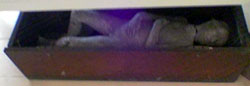 The Sheldon Museum, one of Middlebury's few tourist attractions, was a great disappointment. The renowned collection of oddities consisted of only a few items. There was the petrified indian boy (below), a box full of Sheldon's teeth, a photograph of the headstone of an Egyptian mummy who had been given a christian burial, and a fork which— according to the sign in the display case— had come from a cow's behind.